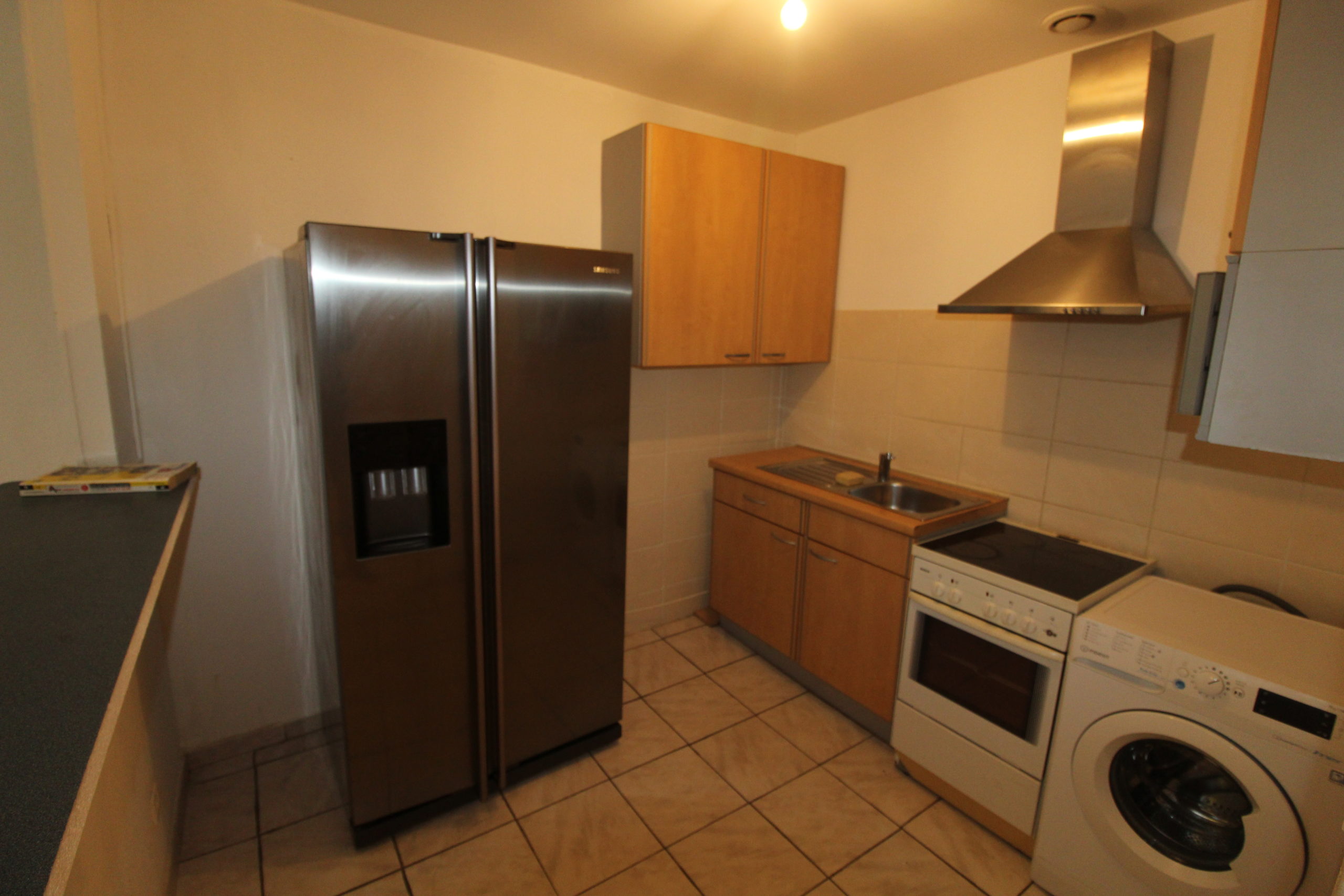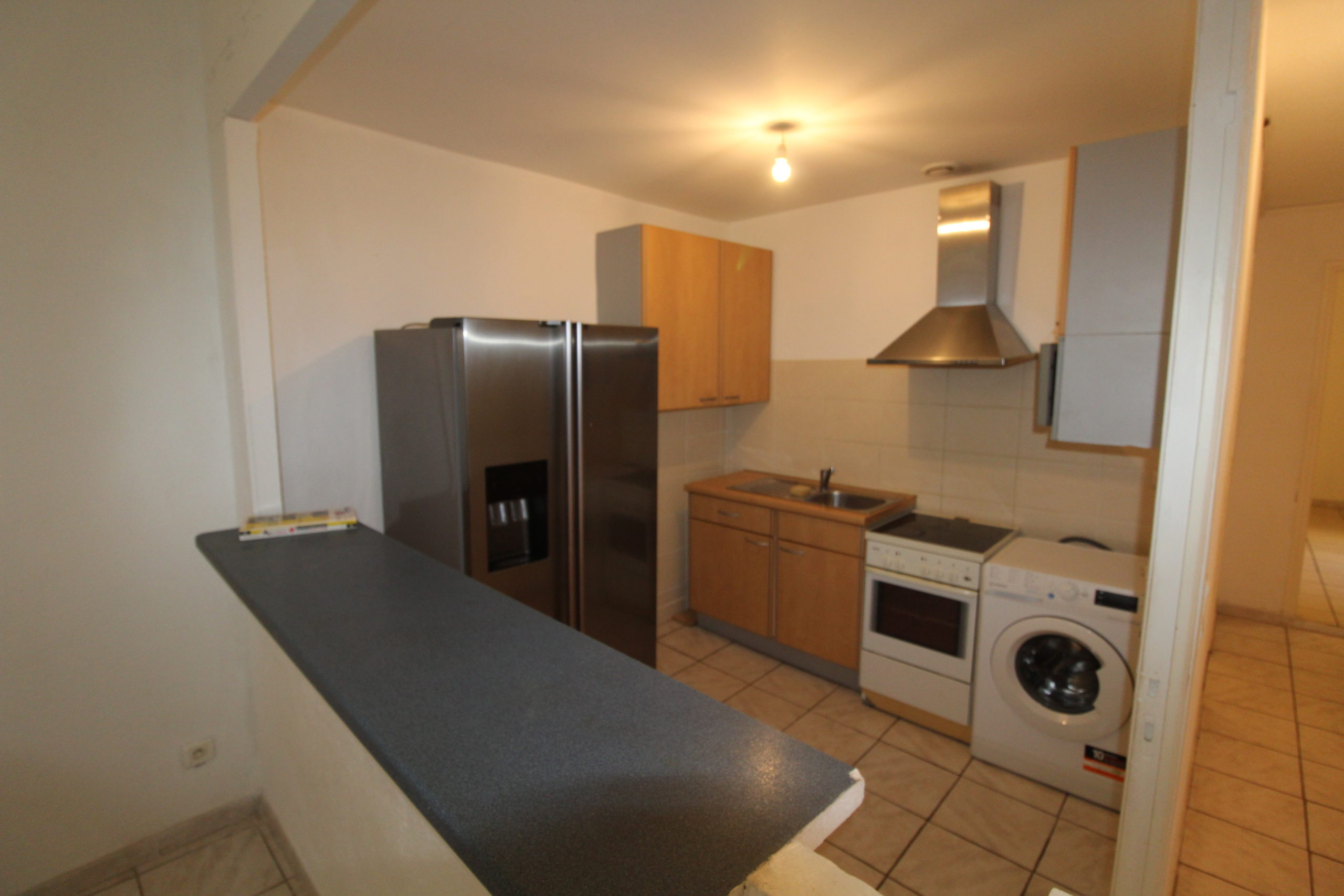 D’une pièce de séjour de 15,42 M2 (2 carreaux cassés), ouverte sur la cuisine américaine équipé et récente (vendu avec le frigo américain) pour 6,73 M2.